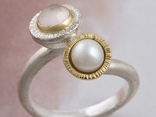 Atelier Solstice – Bague en or, cabochon quartz rose facetté, perle de culture.