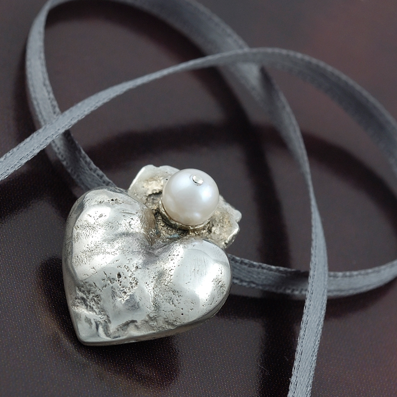 Atelier Solstice Bijoux. Pendentif Cœur tendre, perle de culture Akoya, ruban de satin.