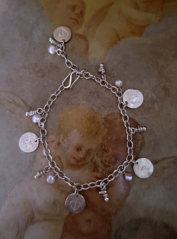 Atelier Solstice Bijoux. Collection Aimons-nous! – Fiancailles. Bracelet pampilles en argent 925 et perles d’eau douce. Un arc en forme de cœur et une flèche.