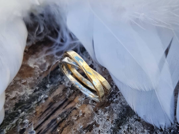 Une bague en or et argent composée de deux rangs d’anneaux martelés croisés sur le dessus. Chaque pièce est forgée manuellement aux marteaux