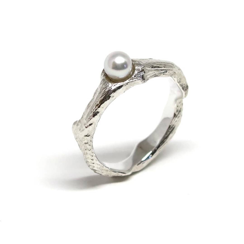 Bague «branche» en argent et perle de culture Akoya 4-4.5 mm. Aussi disponible en différents alliages d’or (gris, rose ou jaune) sur commande. Devis sur demande.