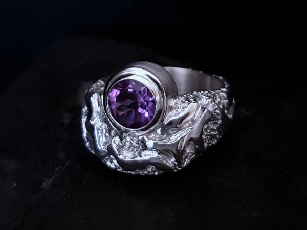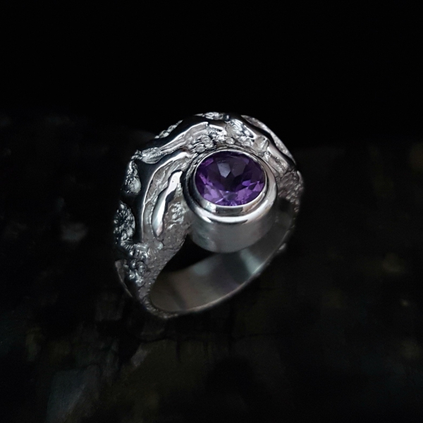 Bague en argent avec motifs polis, texture et améthyste du Brésil.
