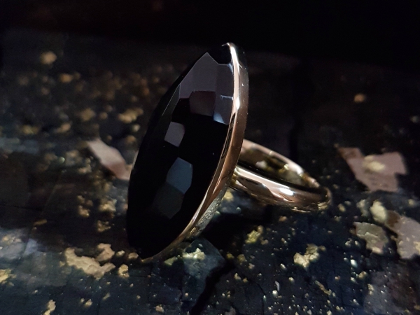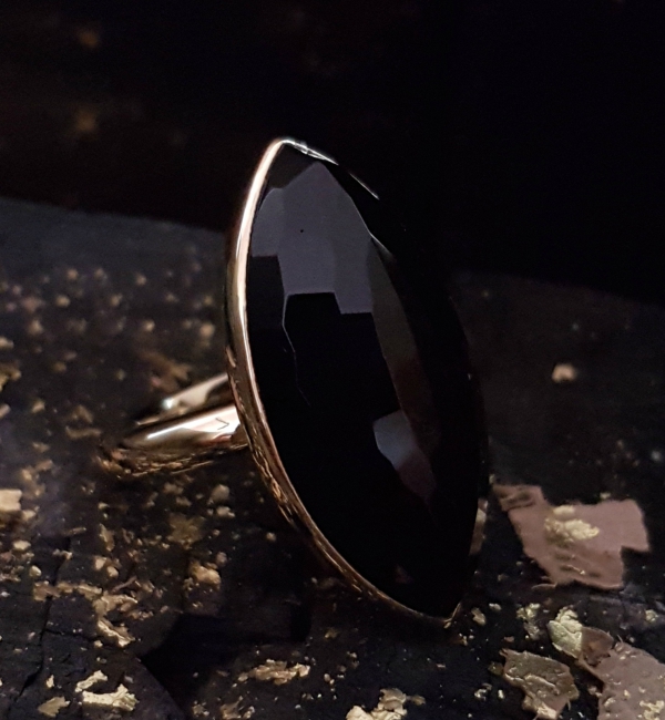 Bague en or jaune 750 et onyx noir facetté taille marquise.