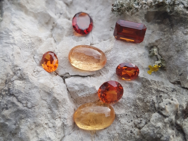 Différents grenats spessartites et topazes impériales disponibles pour ma clientèle afin d’être montés en bijoux.