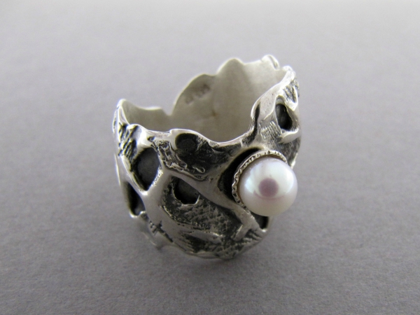 Bague végétale en argent 925 oxydé et perle de culture rosée Akoya D 6.5 mm.