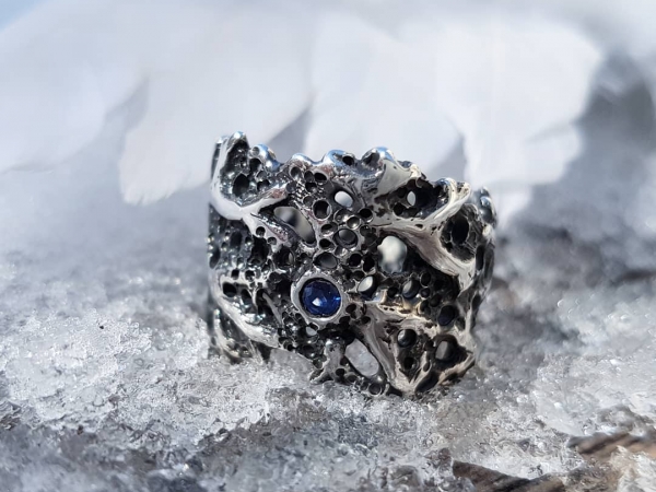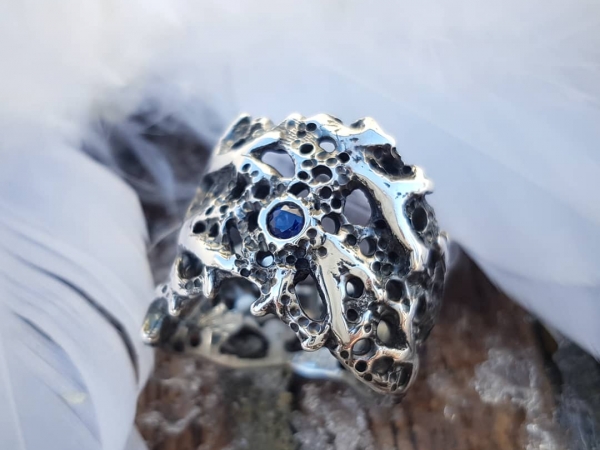 Bague végétale pour homme en argent oxydé et saphir bleu, réalisée sur mesure. Chaque pièce est travaillée à la main et présente quelques différences. Cire perdue.