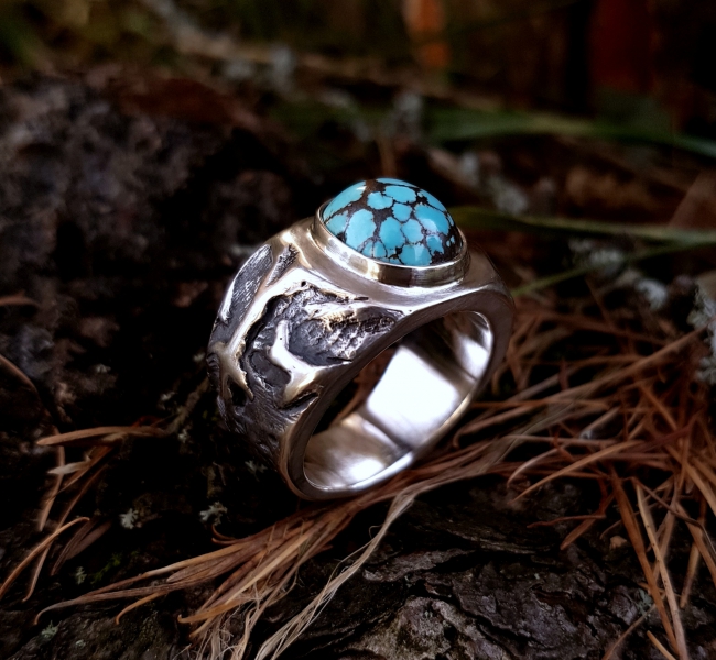 Bague végétale pour homme en argent oxydé réalisée sur mesure. Chaque pièce est travaillée à la main et présente quelques différences. Cire perdue.