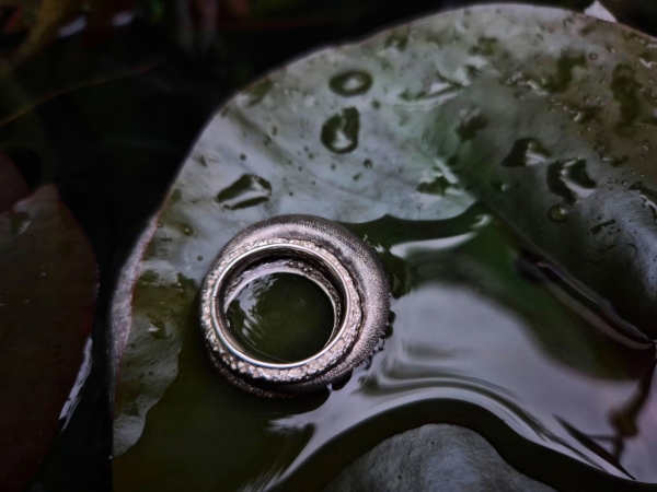 Bague bombée forgée en argent avec textures et deux anneaux fins structurés, trois éléments.