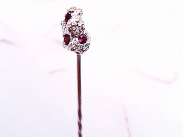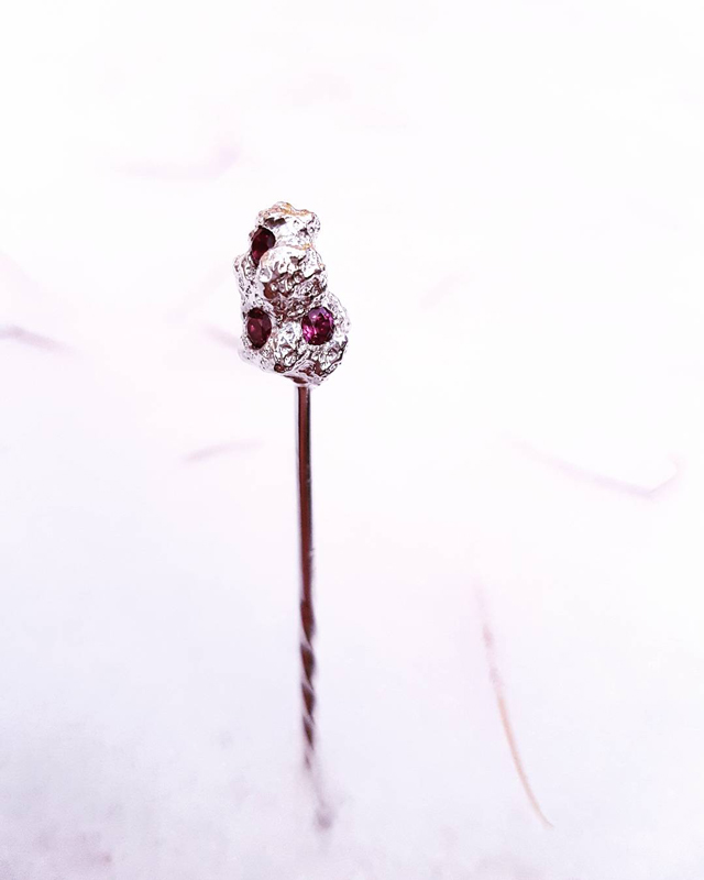 Fonte artisanale au sable avec quatre grenats rhodolites ronds D 3 mm sertis dans la matière brute.