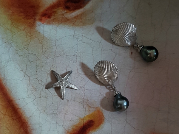 Boucles d’oreilles coquillages avec perles baroques de Tahiti.