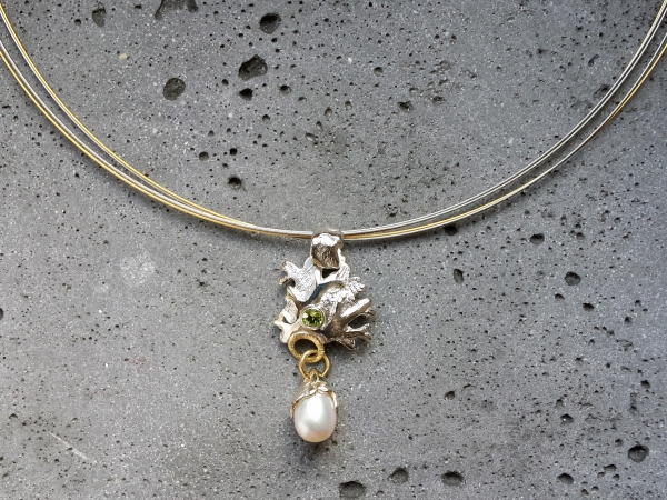 Argent 925, Collier câbles acier inox bicolor, Or 750 jaune, Péridot 4 mm, Perle Akoya goutte