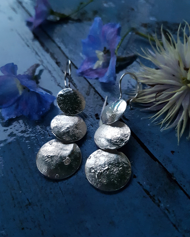 En phases lunaires de changements intérieurs… Boucles d’oreilles articulées en argent 925 réticulé. Trois rangs. Chaque paire est unique, réalisée à la main à l’établi.
