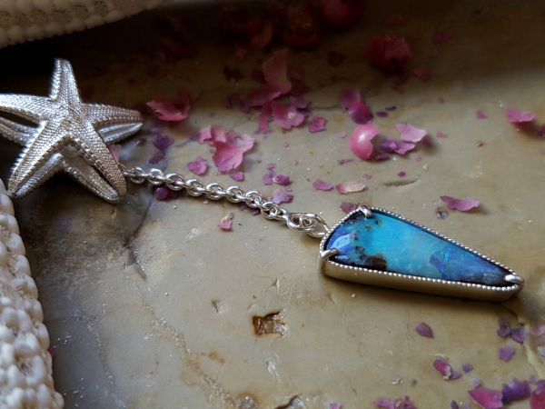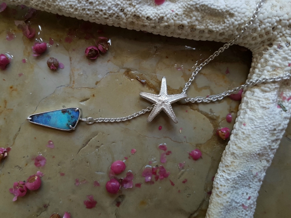 Murmures d’été… Collier-chaînette avec un pendentif étoile de mer en argent 925 et une opale Boulder. Ce pendentif est vendu mais disponible sur commande avec une pierre de votre choix et un délai de fabrication.