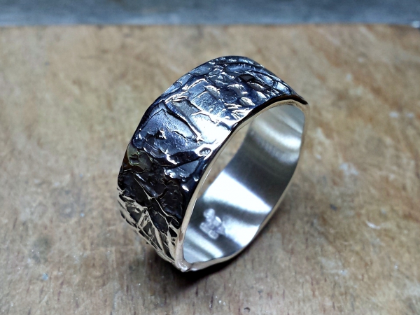 La matière brute a été travaillée manuellement sur l’enclume du forgeron pour obtenir cette structure unique, puis façonnée sur la cheville de l’établi de la bijoutière. Le métal garde les traces de ce travail 100% authentique.
