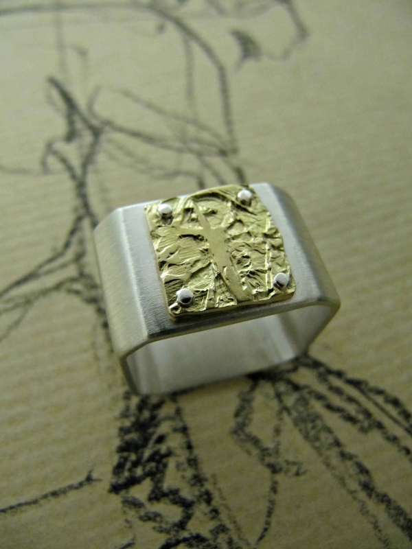 Bague pour homme en argent 925 et or jaune 750, forme carrée. Style chevalière.
