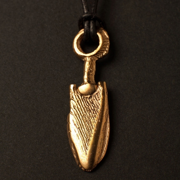 Flèche numérotée de 1 à 5. Le bijou symbole. Cordon de cuir brun, fermoir «S» en laiton. Deux modèles numérotés encore disponibles sur commande avec libre choix de la matière: or, argent ou bronze.