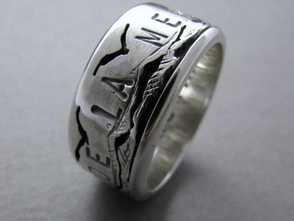 Anneau en argent 925 avec une phrase poinçonnée à l’extérieur et à l’intérieur.