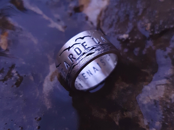 Anneau en argent 925 avec une phrase poinçonnée à l’extérieur et à l’intérieur.